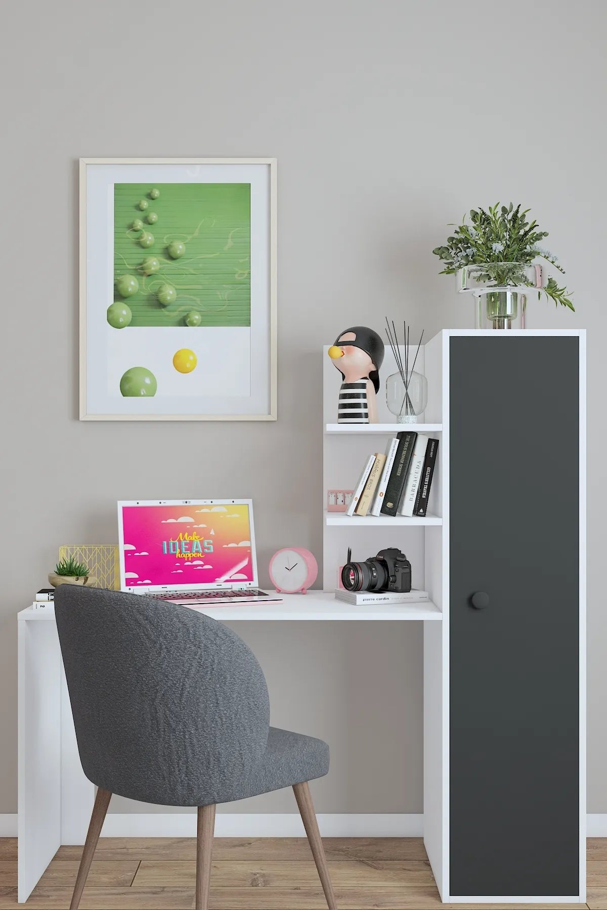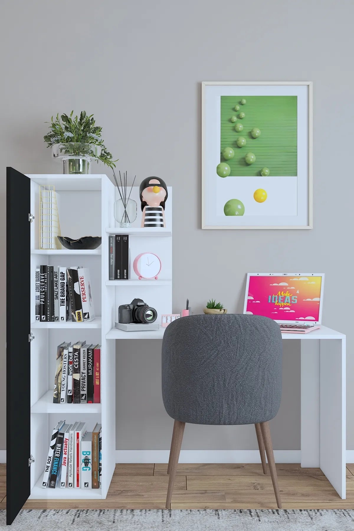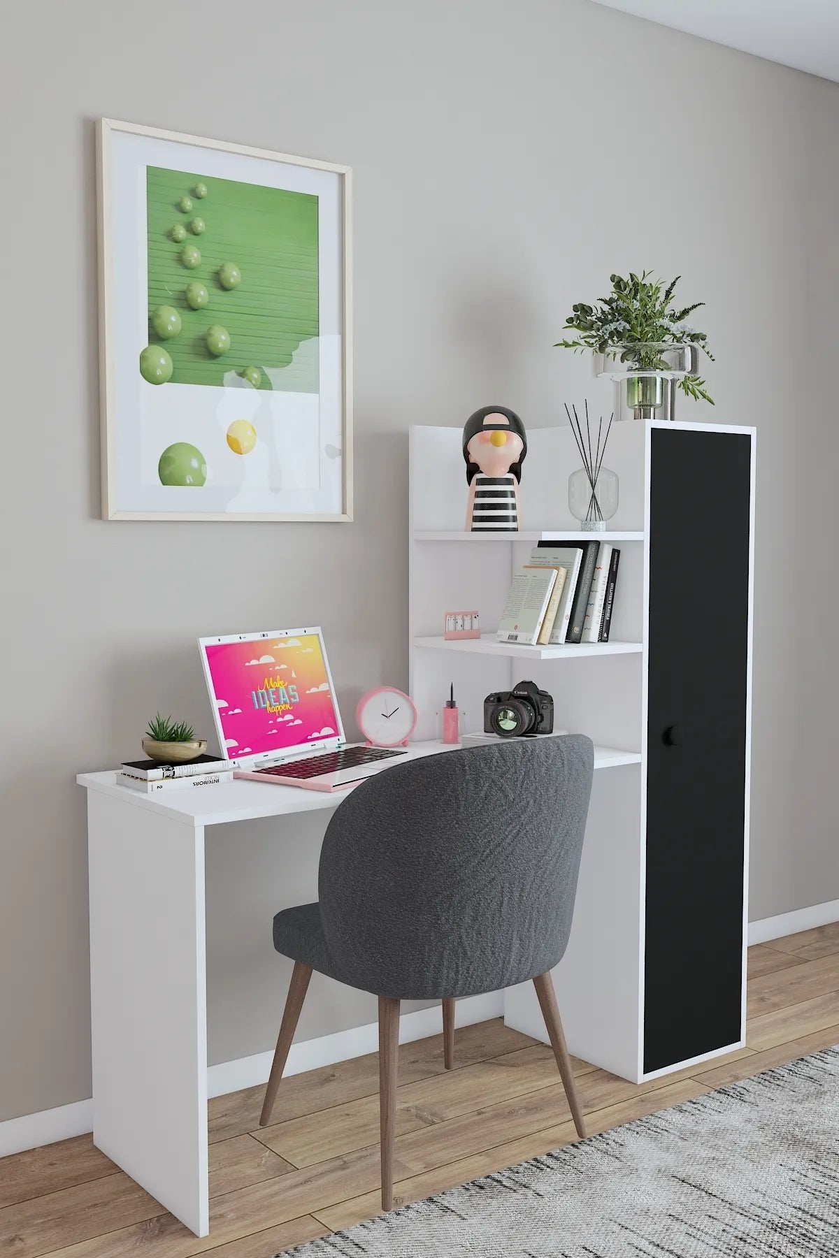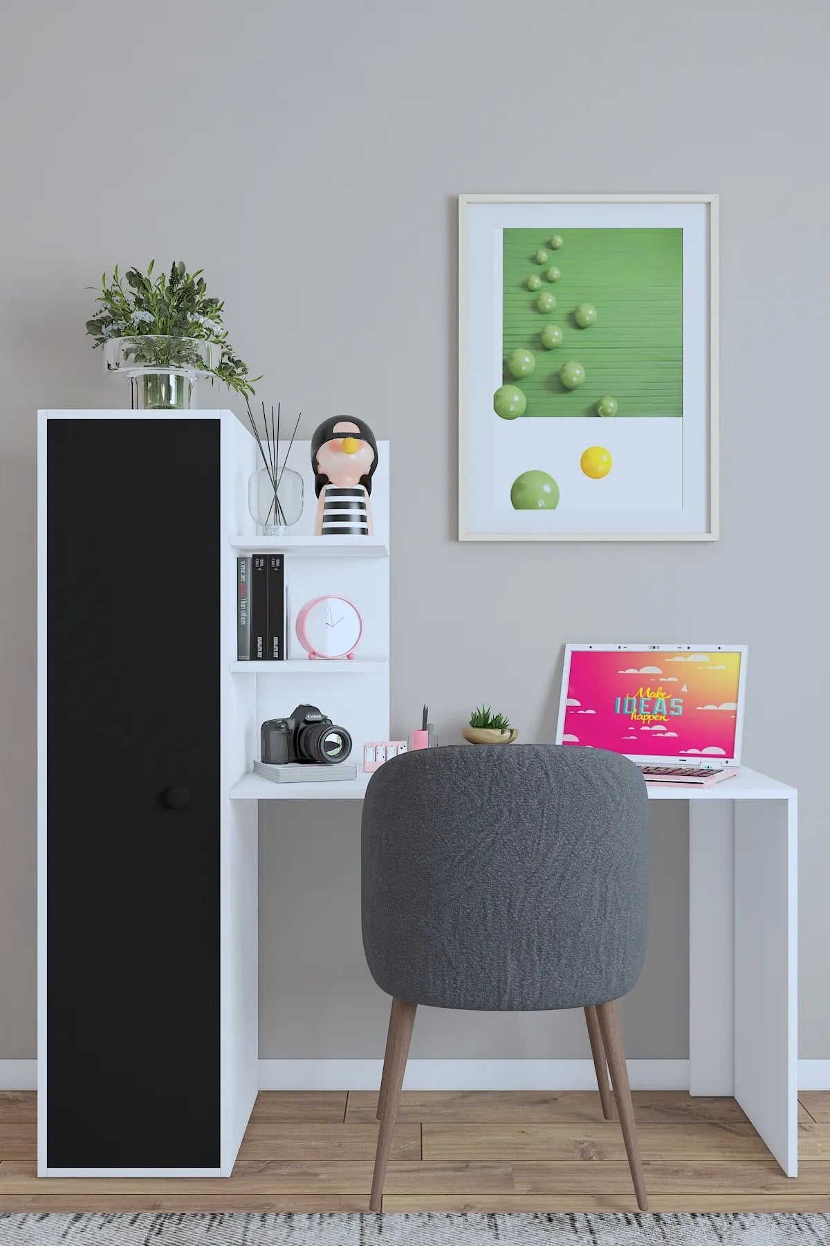 - Dekoronya Luna Dolaplı Sağa ve Sola Kurulabilir Çalışma Masası Beyaz Masa Siyah Kapak