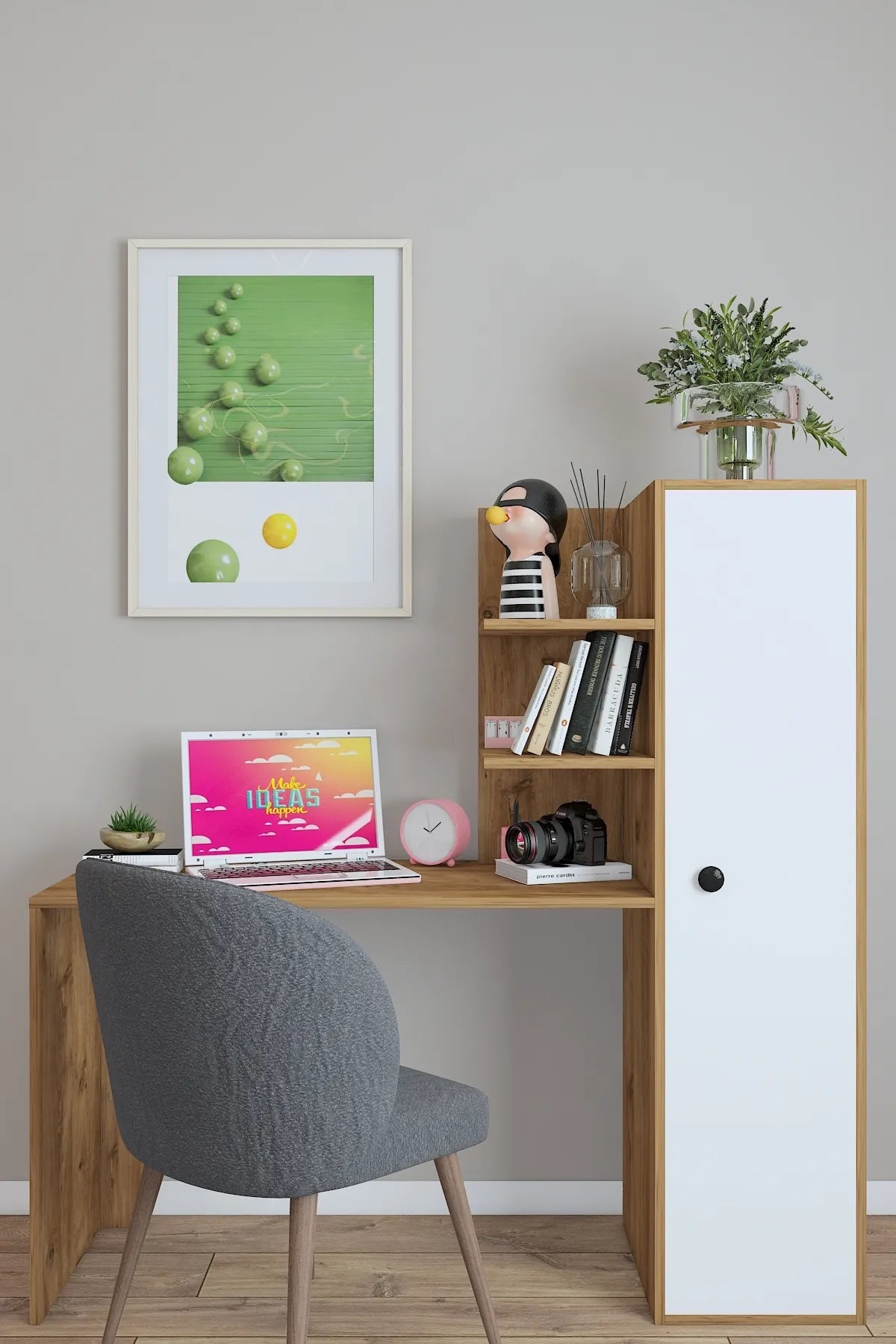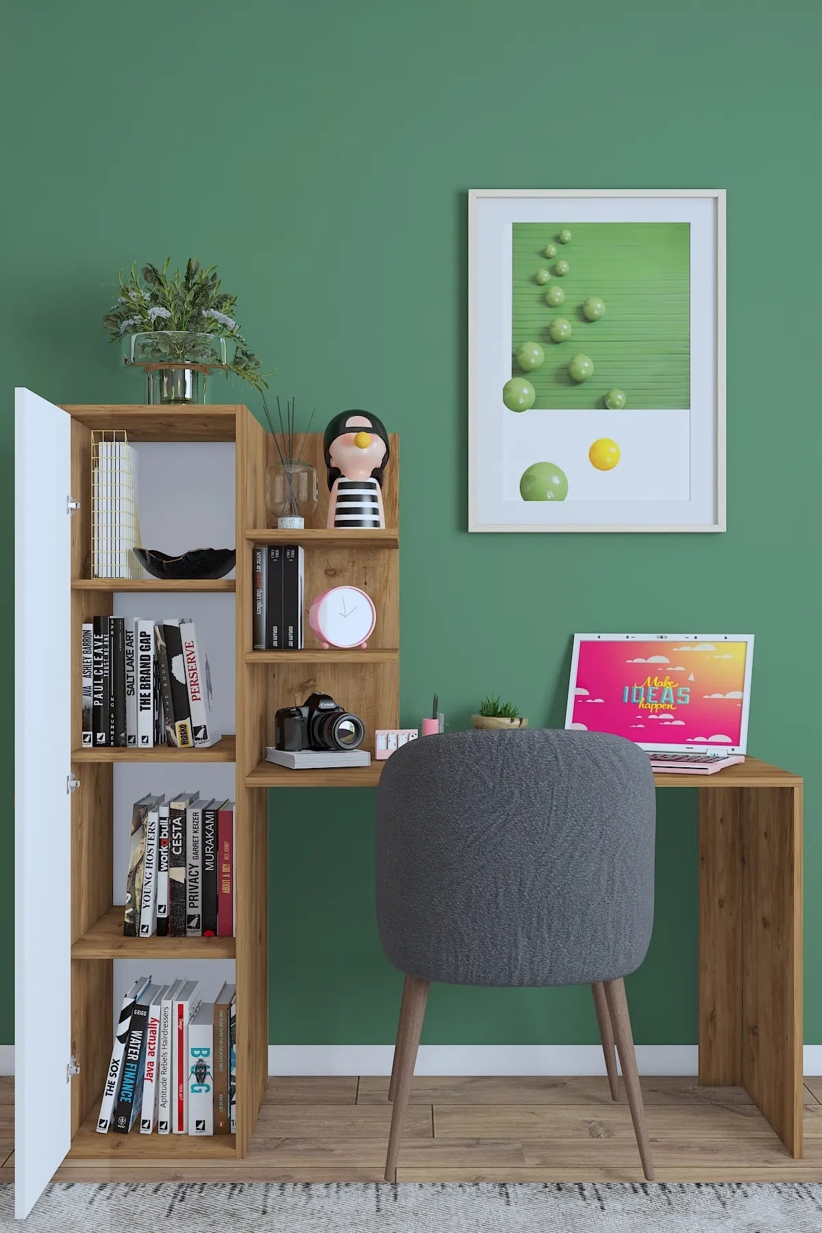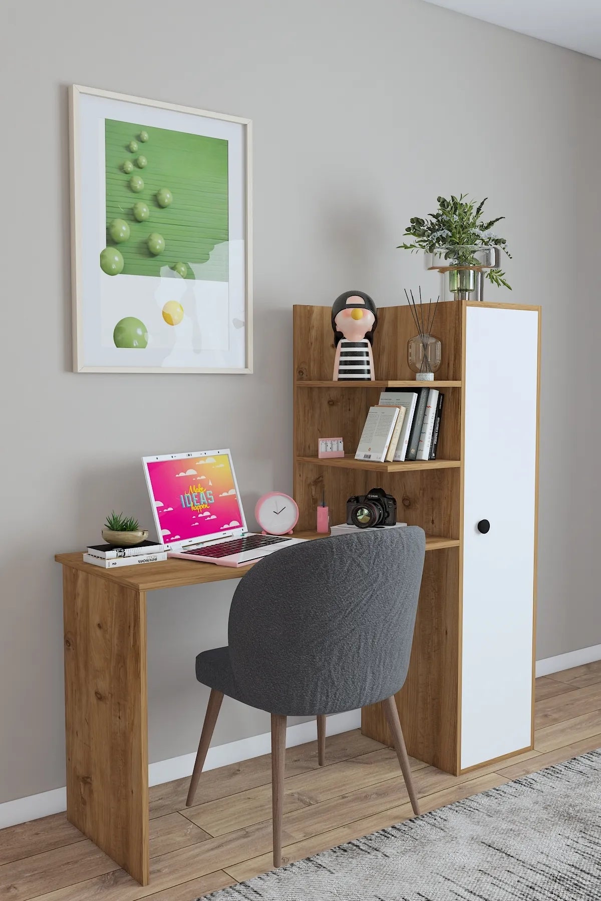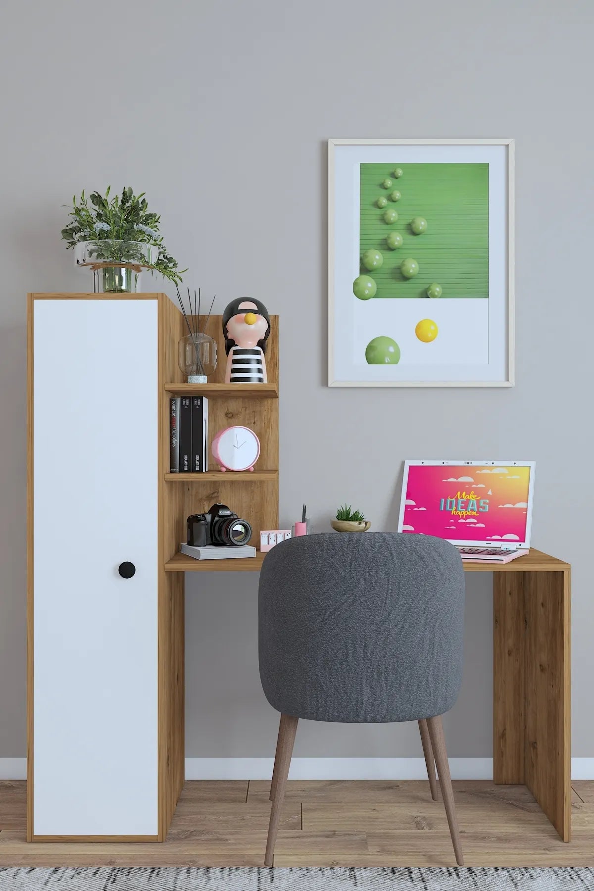 - Dekoronya Luna Dolaplı Sağa ve Sola Kurulabilir Çalışma Masası Meşe Masa Beyaz Kapak