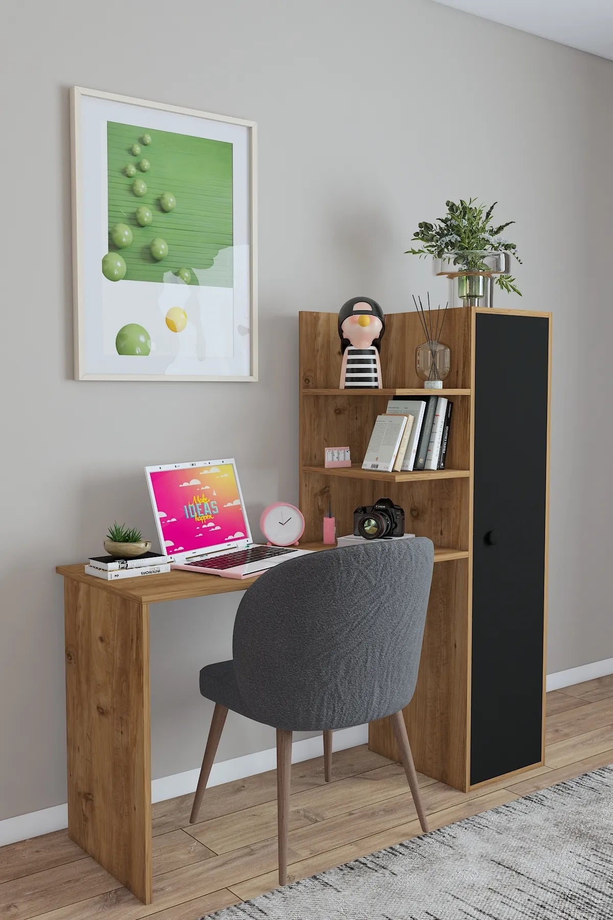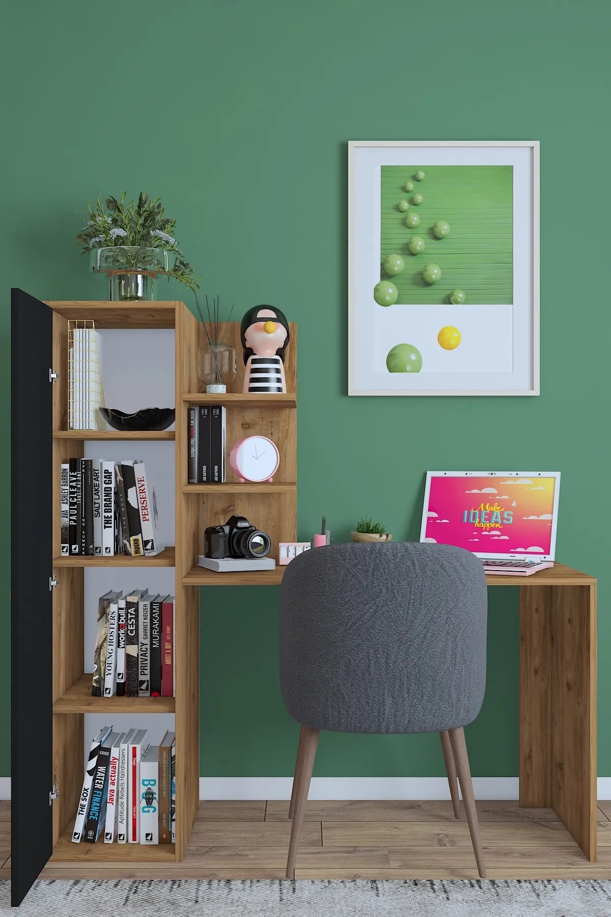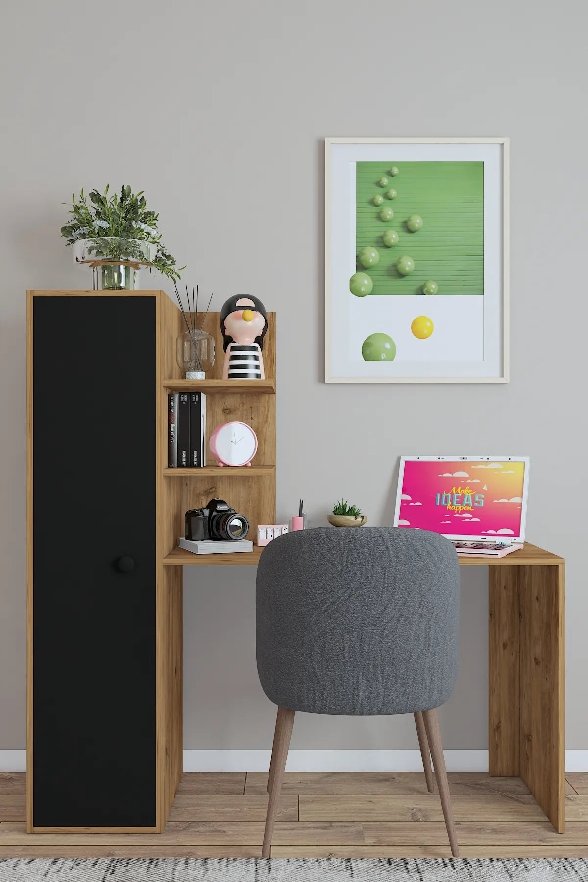 - Dekoronya Luna Dolaplı Sağa ve Sola Kurulabilir Çalışma Masası Meşe Masa Siyah Kapak