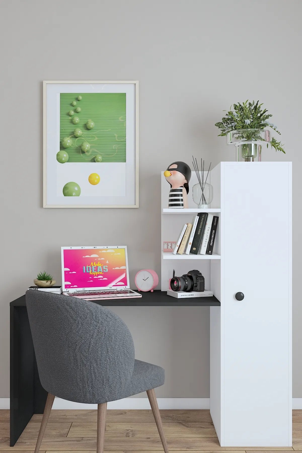 - Dekoronya Luna Dolaplı Sağa ve Sola Kurulabilir Çalışma Masası Siyah Masa Beyaz Kitaplık