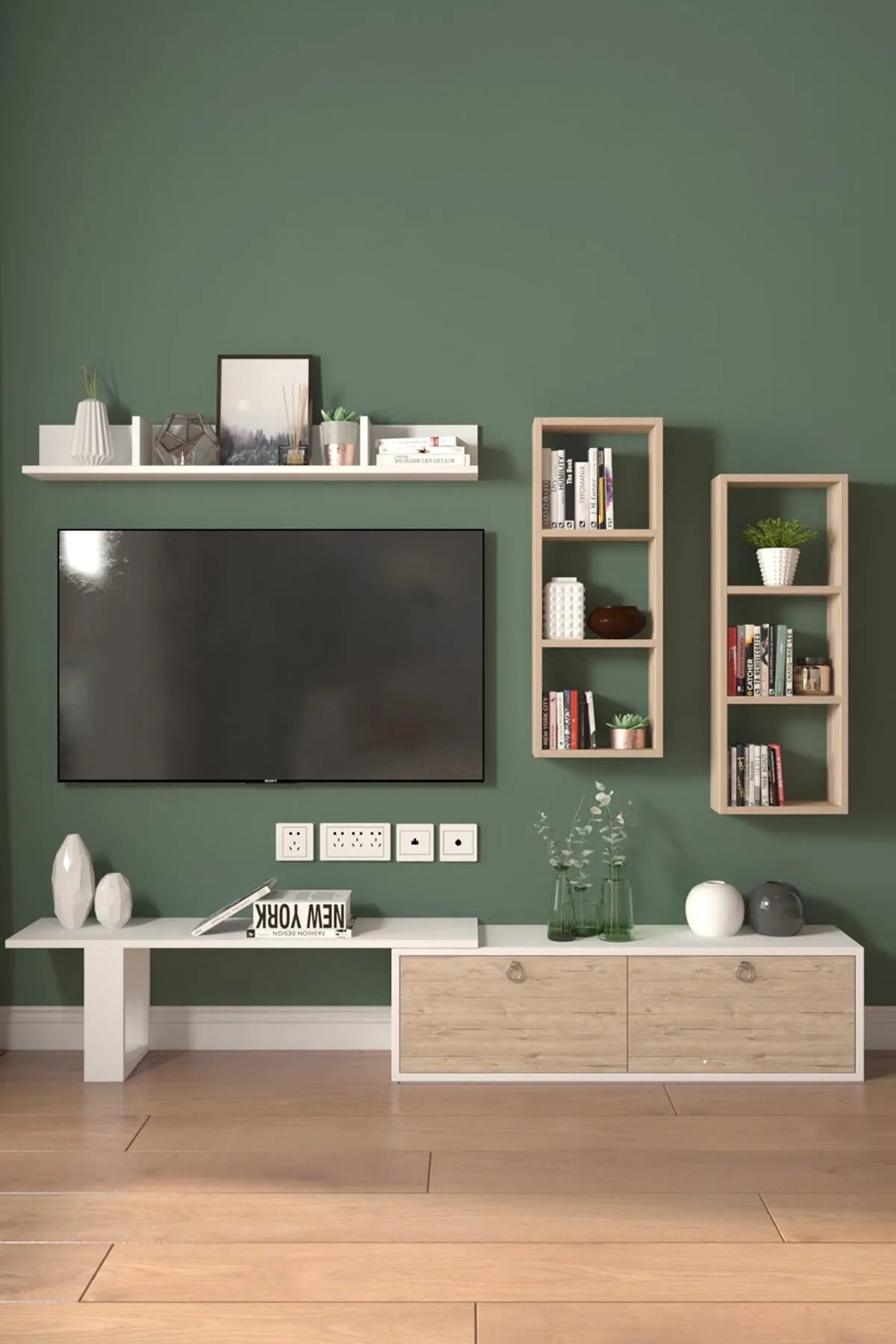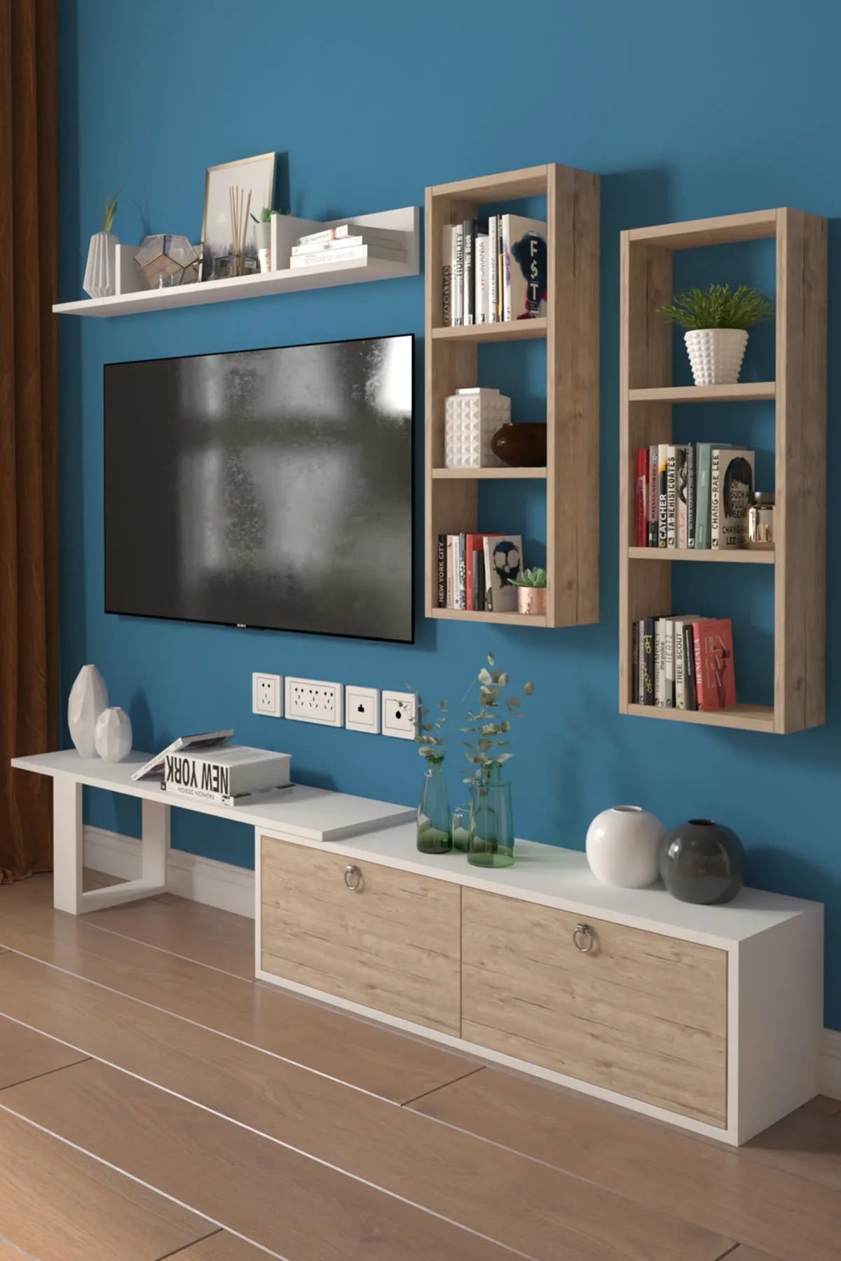 - Dekoronya Zera Raf Kitaplıklı Ve Dolap Kapaklı Tv Ünitesi Meşe